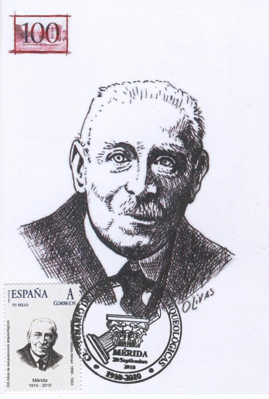 Coincidiendo con el “100 aniversario de las excavaciones arqueológicas en Mérida” el "Grupo Filatélico Emeritense", ha querido rendir homenaje a dos ilustres arqueólogos, gracias a los cuales el yacimiento arqueológico de Mérida tiene la gran importancia y reconocimiento internacional a día de hoy.